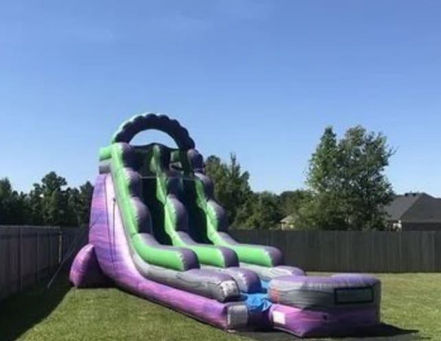 Transform your upcoming event into a thrilling adventure with the Purple Thunder Slide, an 18' tall inflatable water slide that promises excitement and fun for all ages! Whether you're planning a birthday party, charity event, wedding, or family gathering, this vibrant purple marble slide will be the highlight of the day.